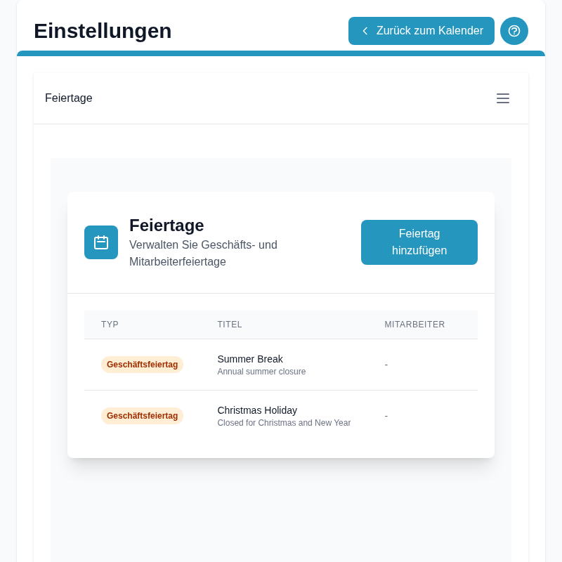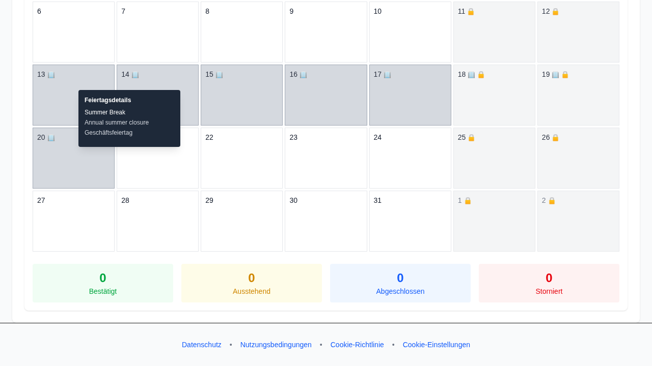 Legen Sie Betriebsferien und vollständige Schließzeiten im Voraus fest, damit in diesen Zeiträumen keine Buchungen möglich sind.