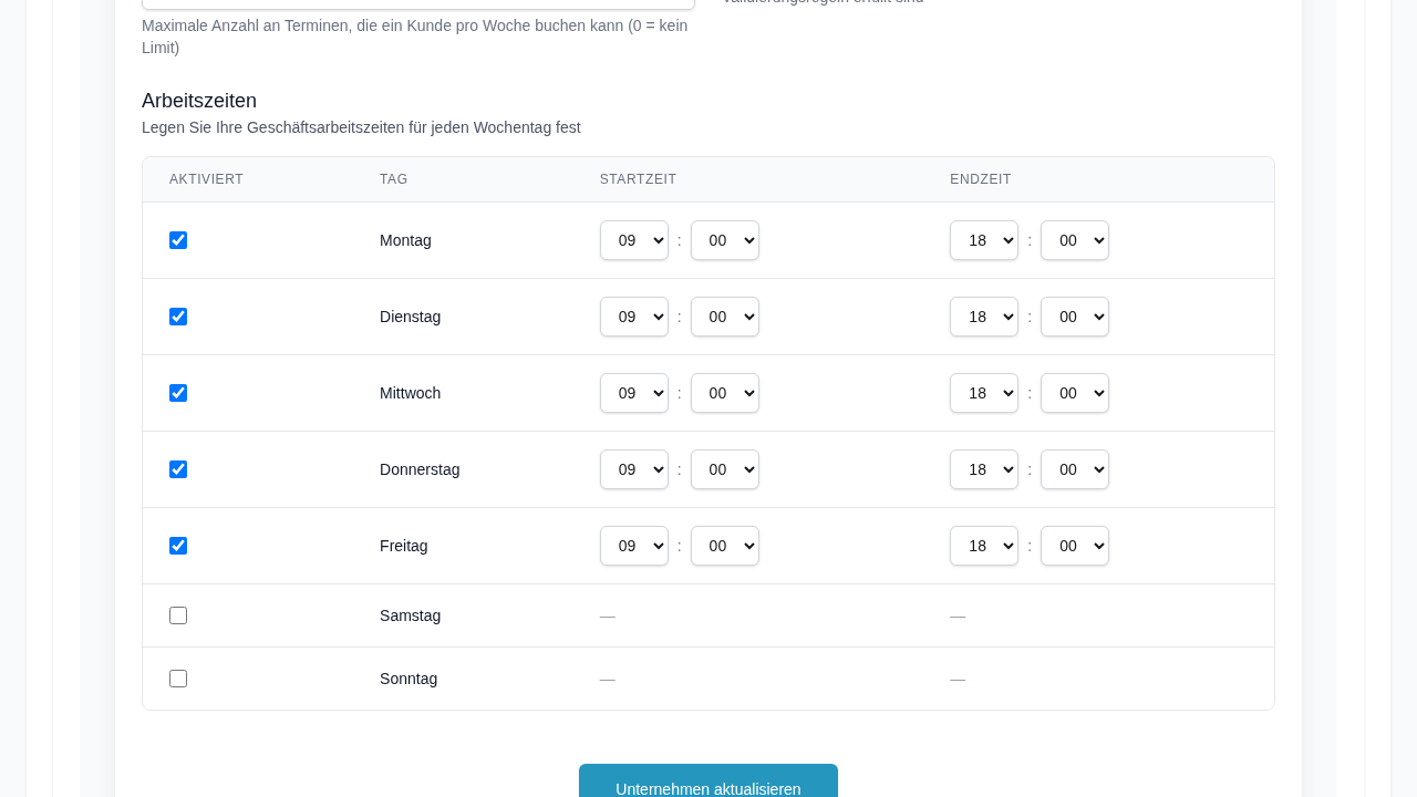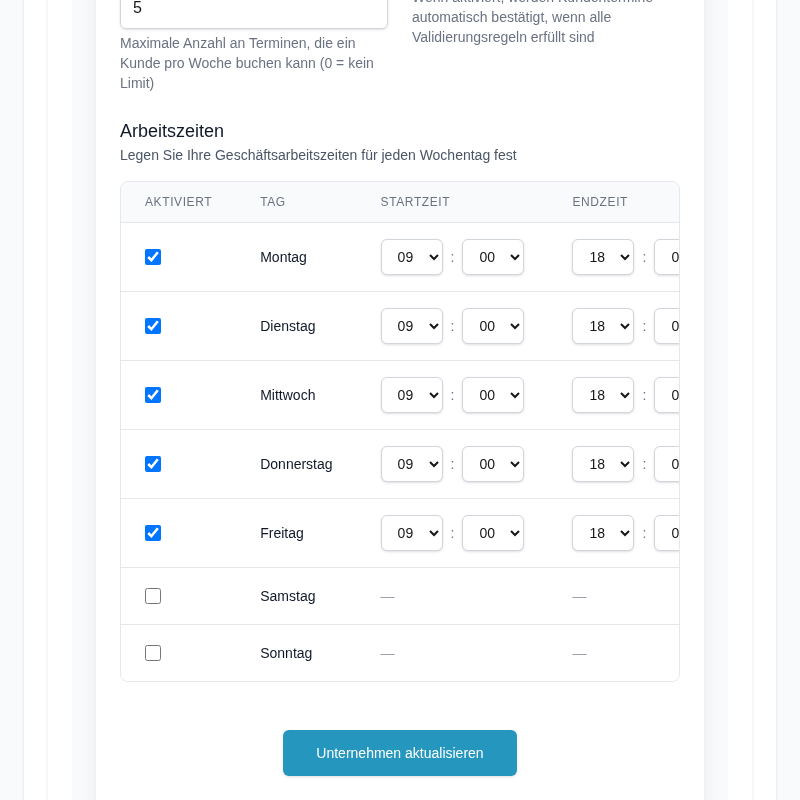 Definieren Sie Öffnungs- und Schließzeiten für jeden Wochentag, pro Mitarbeiter oder für das gesamte Unternehmen.