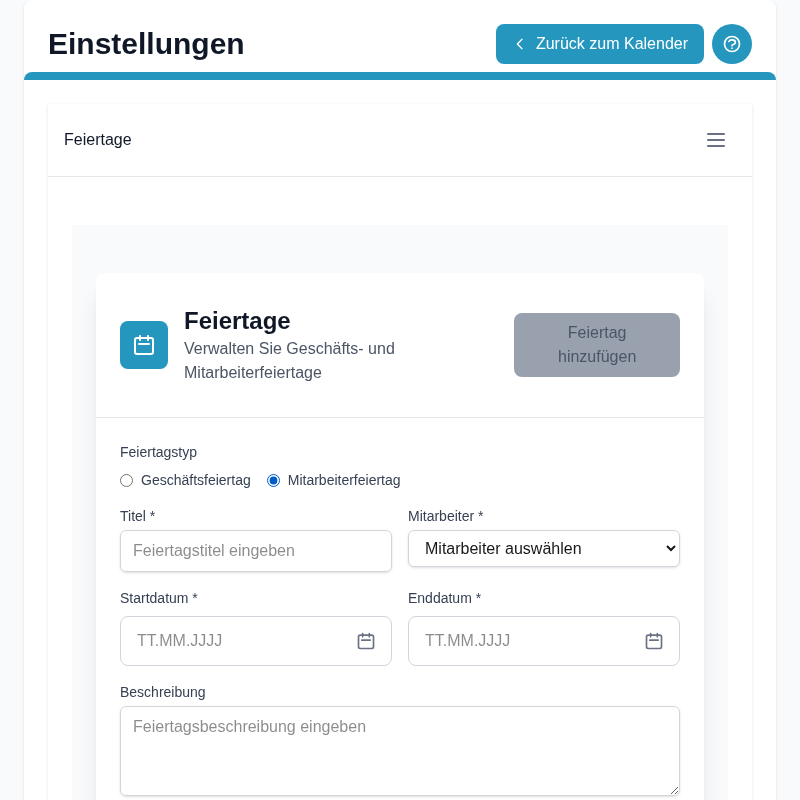 Tragen Sie Urlaube und gesperrte Zeiten für einzelne Mitarbeiter ein, damit diese in Abwesenheit nicht buchbar sind.